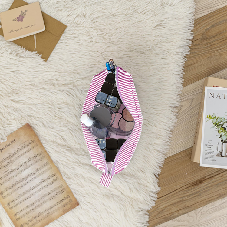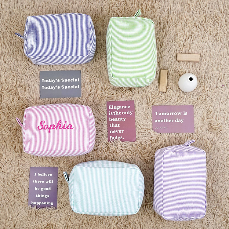 Manufacturer Custom Printed Letter Logo Cute Small Mini Soft Seersucker Natural Cotton Makeup Pouch Cosmetic Bag For Women